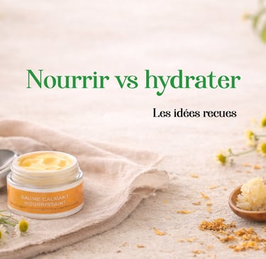 Nourrir signifie apporter des corps gras (lipides) à la peau. Une peau nourrie est une peau dont la barrière protectrice est renforcée. La peau possède un film naturel appelé film hydrolipidique, composé de lipides céramides, acides gras essentiels, sébum. C’est ce film qui empêche l’eau de s’évaporer, protège des agressions (froid, pollution, etc) limite les irritations et rougeurs. Quand cette barrière est fragilisée, la peau devient : rugueuse sèche en profondeur, inconfortable, plus sensible. Les soins nourrissants contiennent généralement : beurre de karité, beurre de cacao, huile de chanvre, huile d’argan, macérats de calendula, ou plantes apaisantes. C’est exactement ce qu’on retrouve dans un baume nourrissant naturel.